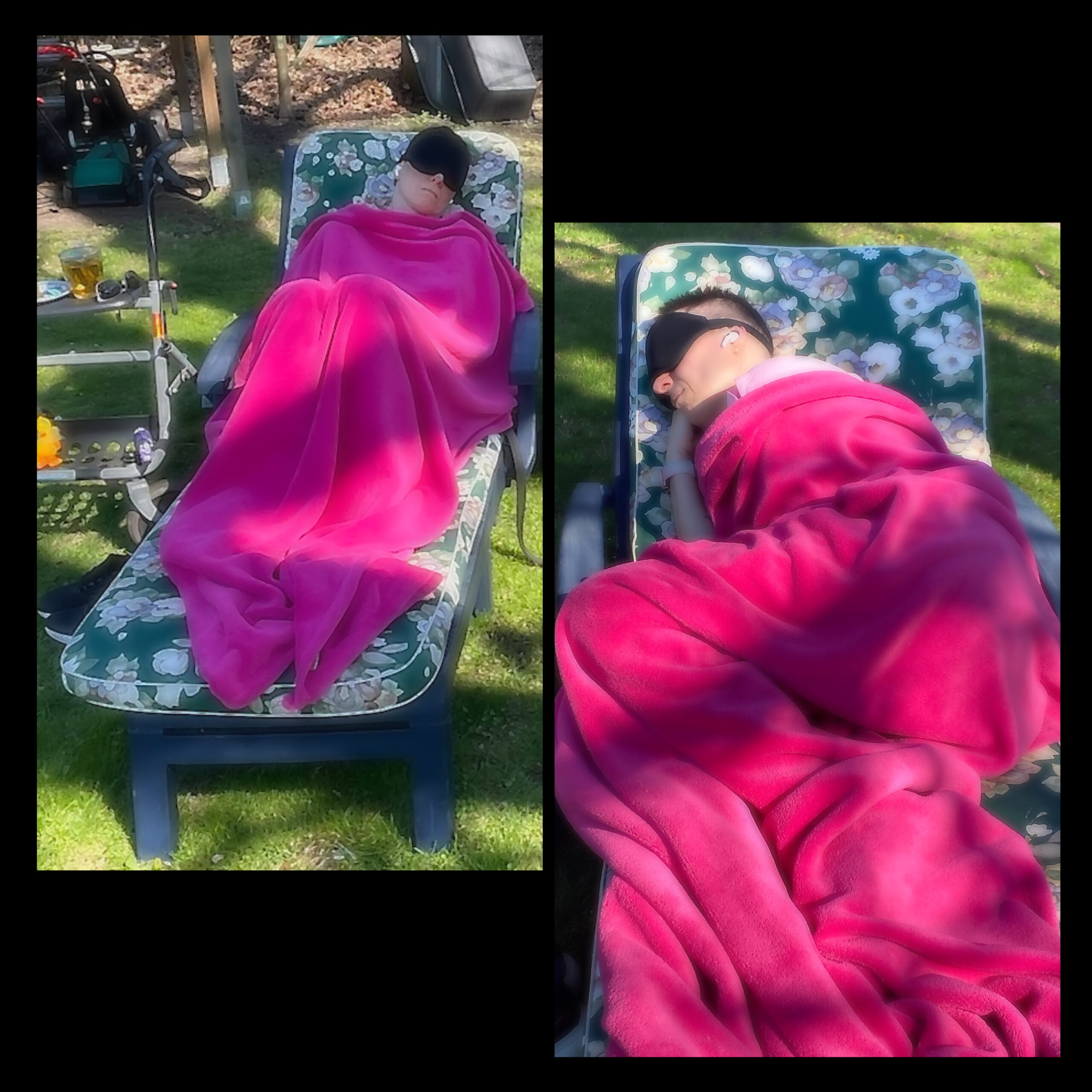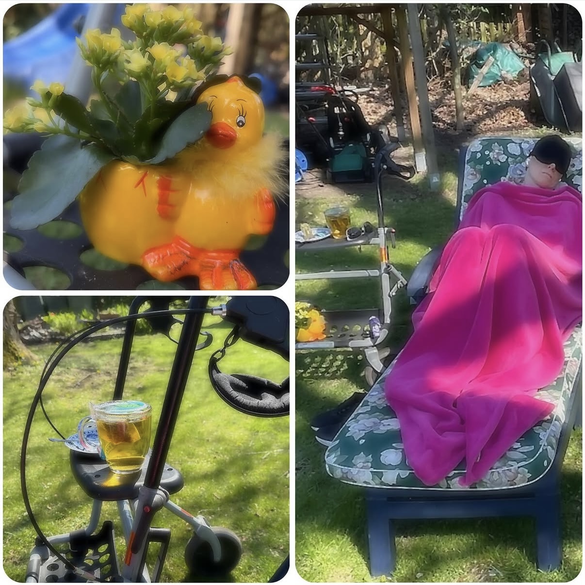 Während sich alle unterhalten konnten, gemeinsam am Tisch saßen und die Kinder fleißig ihre Osterhasen suchten, bekam ich eine Liege, fern ab vom geschehen. Und das war auch notwendig, sonst hätte ich nicht Dabeisein können. Der Rollator diente zwischendurch als Ablage für Tee und Kuchen, was total praktisch war. Meine Schlafmaske und AirPods dienten dazu, dass ich es dunkel habe und nichts höre.